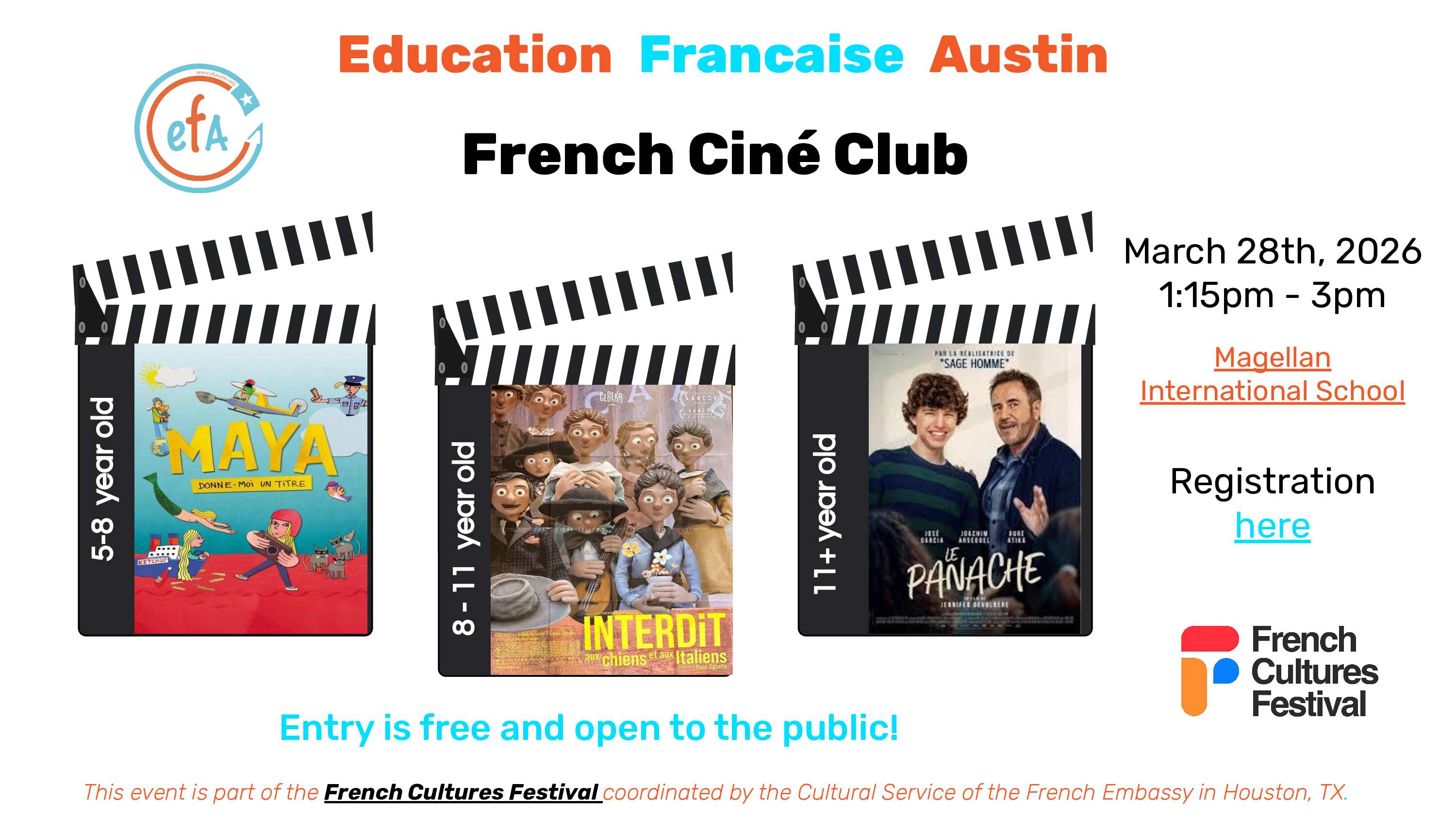 As part of the French Cultures Festival, EFA is organizing a Ciné Club on Saturday, March 28, from 1:15 PM to 3:00 PM, at Magellan International School.